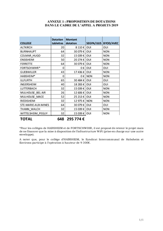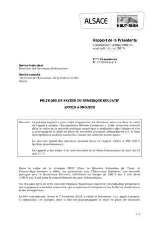 Le présent rapport a pour objet d’approuver les dotations retenues dans le cadre de l’appel à projets « Equipements Mobiles Connectés ». Cette démarche s’inscrit dans le cadre de la nouvelle politique numérique à destination des collèges et vise à accompagner la mise en place de nouvelles pratiques pédagogiques sur la base d’équipements mobiles connectés, comme les tablettes numériques. Le montant global des dotations proposé dans ce rapport s’élève à 296 000 € (section investissement). Ce rapport a fait l'objet d'un avis favorable de la 8ème Commission en date du 24 mai 2019.