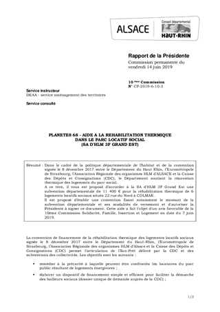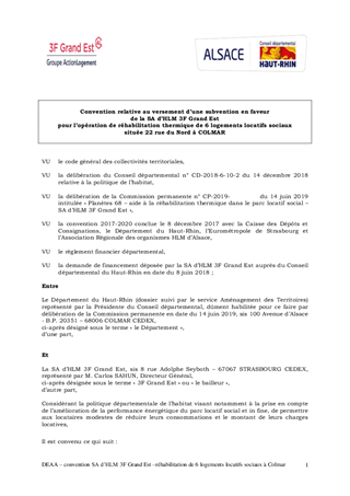 Dans le cadre de la politique départementale de l’habitat et de la convention signée le 8 décembre 2017 entre le Département du Haut Rhin, l’Eurométropole de Strasbourg, l’Association Régionale des organismes HLM d’ALSACE et la Caisse des Dépôts et Consignations (CDC), le Département soutient la rénovation thermique des logements du parc social. A ce titre, il vous est proposé d’accorder à la SA d'HLM 3F Grand Est une subvention départementale de 11 400 € pour la réhabilitation thermique de 6 logements locatifs sociaux situés 22 rue du Nord à COLMAR. Il est proposé d’établir une convention fixant notamment le montant de la subvention départementale et ses modalités de versement et d'autoriser la Présidente à signer ce document. Cette aide a fait l'objet d'un avis favorable de la 10ème Commission Solidarité, Famille, Insertion et Logement en date du 7 juin 2019.