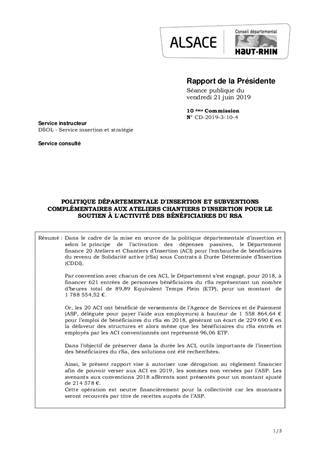 POLITIQUE DÉPARTEMENTALE D'INSERTION ET SUBVENTIONS COMPLÉMENTAIRES AUX ATELIERS CHANTIERS D'INSERTION POUR LE SOUTIEN À L'ACTIVITÉ DES BÉNÉFICIAIRES DU RSA