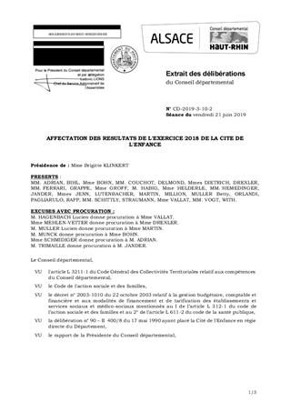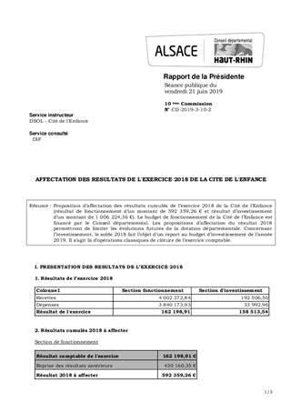 Proposition d’affectation des résultats cumulés de l’exercice 2018 de la Cité de l’Enfance (résultat de fonctionnement d’un montant de 592 359,26 € et résultat d’investissement d’un montant de 1 006 224,36 €). Le budget de fonctionnement de la Cité de l’Enfance est financé par le Conseil départemental. Les propositions d’affectation du résultat 2018 permettront de limiter les évolutions futures de la dotation départementale. Concernant l’investissement, le solde 2018 fait l’objet d’un report au budget d’investissement de l’année 2019. Il s’agit là d’opérations classiques de clôture de l’exercice comptable.