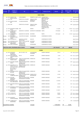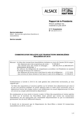 Le bilan des transactions immobilières réalisées au cours de l’année 2018 compte: - des dépenses pour des acquisitions de voirie : 9 339,08 € - des recettes pour des ventes et échanges : 308 963,48 € (à BRUNSTATT-DIDENHEIM, MUNSTER…) Par ailleurs, les délégations de compétences accordées à la Présidente en matière de louage de locaux ont conduit à : - des dépenses de locaux pris à bail dans le cadre de la délégation : 2 717,48 € - des recettes de biens donnés à bail dans le cadre de la délégation : 13 256,00 €.