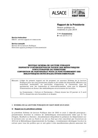 L’objet du présent rapport est de proposer un nouveau Schéma de la Lecture Publique pour les cinq prochaines années et de valider les dispositifs afférents aux évolutions souhaitées, en particulier d’approuver la convention type de partenariat avec les communes et intercommunalités, ainsi que le dispositif d’intervention en faveur des médiathèques structurantes de territoire. La Commission « Culture et Patrimoine » (7ème) réunie les 25 janvier et 5 avril 2019 a donné des avis favorables à ce dossier.