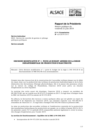 DECISION MODIFICATIVE N° 1 POUR LE BUDGET ANNEXE DE LA REGIE DEPARTEMENTALE DE PRODUCTION D'ELECTRICITE