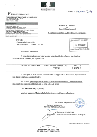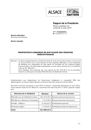Le Payeur départemental a établi des états de titres de recettes restant à recouvrer au 26 avril 2019. Au vu des dossiers et des requêtes effectuées, il vous demande de délibérer sur l’admission en non-valeur de certaines de ces créances jugées irrécouvrables. Ces demandes d’admission en non-valeur portent sur un montant total de 321 880,22 €. Cette dépense sera atténuée par une reprise de 301 875,28 € sur la provision inscrite au bilan pour les indus RSA (Revenu de Solidarité Active).