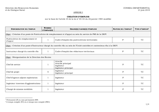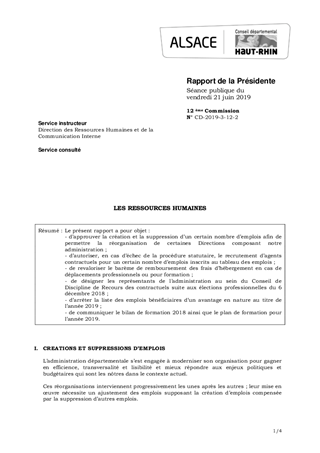 Le présent rapport a pour objet : - d’approuver la création et la suppression d’un certain nombre d’emplois afin de permettre la réorganisation de certaines Directions composant notre administration ; - d’autoriser, en cas d’échec de la procédure statutaire, le recrutement d’agents contractuels pour un certain nombre d’emplois inscrits au tableau des emplois ; - de revaloriser le barème de remboursement des frais d’hébergement en cas de déplacements professionnels ou pour formation ; - de désigner les représentants de l’administration au sein du Conseil de Discipline de Recours des contractuels suite aux élections professionnelles du 6 décembre 2018 ; - d’arrêter la liste des emplois bénéficiaires d’un avantage en nature au titre de l’année 2019 ; - de communiquer le bilan de formation 2018 ainsi que le plan de formation pour l’année 2019.