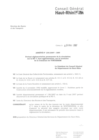 portant réglementation permanente de la circulation sur la RD7, hors agglomération, sur le territoire de la commune de TURCKHEIM. Resumé Pièces jointes ARRETE Assemblée : Non défini Date : 09/05/2007 Rapporteur : Non défini Collectivité : Conseil départemental du Haut-Rhin Direction : Non défini Service : Direction des Routes Domaine : Circulation Commission :