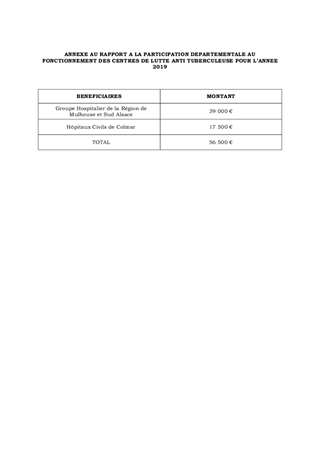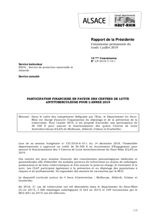 Dans le cadre des compétences déléguées par l’Etat, le Département du Haut-Rhin est chargé d’assurer l’organisation du dépistage et de la prévention de la tuberculose. Pour l'année 2019, il est proposé d'accorder une participation de 56 500 € pour assurer le fonctionnement des quatre Centres de Lutte Antituberculeuse (CLAT) de Mulhouse, Altkirch, Colmar et Guebwiller.