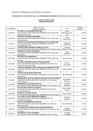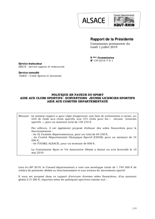 Le présent rapport a pour objet d’approuver une liste de subventions à verser, au titre de l’aide aux clubs sportifs, aux 373 clubs pour les « Jeunes licenciés sportifs », pour un montant total de 138 210 €. Par ailleurs, il est également proposé d’allouer des aides financières pour le fonctionnement : - de 32 Comités départementaux, pour un total de 64 250 €, - du Comité Départemental Olympique Sportif (CDOS), pour un montant de 10 000 €, - de l’UGSEL ALSACE, pour un montant de 800 €. La Commission Sport et Vie Associative (9ème) a donné un avis favorable le 10 mai 2019.
