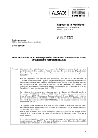 L’insertion des bénéficiaires du revenu de Solidarité active (rSa), et plus particulièrement leur accès à l’emploi, est une des priorités du Département. Cette dynamique repose sur de nombreux leviers qu’il convient de compléter et d’enrichir. Afin de répondre aux besoins des territoires, notamment à MULHOUSE et COLMAR dans le cadre de l’appel à projets annuel pour l’accompagnement social, socioprofessionnel et vers l’emploi des bénéficiaires du rSa, il est proposé d’élargir les interventions de quelques structures ou de renforcer les actions déjà démarrées, validées lors des Commissions Permanentes du 18 janvier 2019 et du 5 avril 2019, pour un montant de 214 750 €. Par ailleurs, les partenariats existants avec la Maison de l’Emploi et de la Formation MULHOUSE Sud Alsace (MEF MSA), formalisés par une convention en début d’année 2019 (Commission Permanente du 8 février 2019), sont renforcés par des subventions particulières, visant l’accès à l’emploi des bénéficiaires du rSa, sur le dispositif transfrontalier INTERREG et les clauses d’insertion pour un montant de 50 000 €. Ce rapport porte également sur une nouvelle action d’insertion intitulée les « Ambassadeurs du bénévolat » dans le cadre du dispositif « rSa & bénévolat » pour un montant de 15 000 €. Toutes ces actions s’inscrivent pleinement dans les objectifs de la convention d’appui à la lutte contre la pauvreté et d’accès à l’emploi entre l’Etat et le Département. Il est ainsi proposé de valider, par le présent rapport, un montant de dépenses complémentaires de 279 750 €, dans la limite des crédits d'insertion disponibles ainsi que les conventions et avenants afférents.