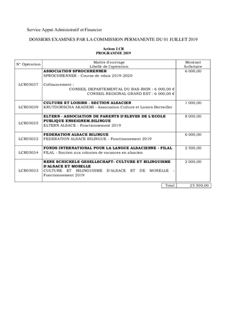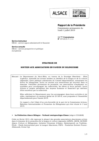 Le Département du Haut-Rhin, au travers de la Stratégie Oberrhein - Rhin supérieur, intensifie les actions menées au bénéfice de la langue et de la culture régionales. Cette politique volontariste du Conseil départemental, notamment en faveur du bilinguisme, inclut un soutien aux associations qui œuvrent dans ce domaine. Véritables partenaires de proximité, ces associations s’impliquent au quotidien pour accompagner les collectivités, les élèves et leurs parents. Leurs actions et projets nécessitent des moyens humains et financiers qui méritent d’être soutenus par la collectivité. Elles sollicitent le Département pour les accompagner dans leurs activités et six aides, représentant un montant global de 25 500 €, sont proposées à l’Assemblée départementale pour l’année 2019. Ce rapport a fait l’objet d’un avis favorable de la part de la Commission Actions, Relations Internationales et Promotion du Bilinguisme qui s’est réunie le 3 mai 2019.