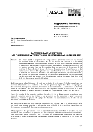 En octobre 2018, le Département a organisé une première édition de l'opération "ça turbine" dans le Haut-Rhin. Au vu du succès de l'édition, il a souhaité renouveler l'exercice en choisissant à nouveau le sujet de la transition énergétique et écologique "les pionniers de la transition" afin de créer une émulation autour de ces enjeux et faire émerger des projets dans un contexte de fermeture de la centrale de Fessenheim. 5 jours éclectiques de rencontres, de conférences et de visites auront lieu du 30 septembre au 4 octobre 2019 avec pour sujets l’énergie, la mobilité, les nouveaux modes de vie, l’écologie industrielle, les circuits courts, les savoirs, les paysages de demain, la rénovation énergétique, la philanthropie etc. Un concours "ça innove" pour favoriser des projets innovants doté d'un prix de 5 000 Euros sera lancé le 15 juillet.