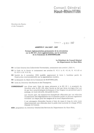 portant réglementation permanente de la circulation sur la RD 25 I, hors agglomération, sur le territoire de la commune de BUETHWILLER. Resumé Pièces jointes ARRETE Assemblée : Non défini Date : 09/05/2007 Rapporteur : Non défini Collectivité : Conseil départemental du Haut-Rhin Direction : Non défini Service : Direction des Routes Domaine : Circulation Commission :