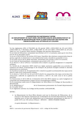 Le présent rapport a pour objet d'approuver six conventions relatives à la restauration scolaire concernant les collèges ayant un partenariat avec des collectivités (Mulhouse Alsace Agglomération et Région Grand Est) et d'autoriser la Présidente à les signer. Ces conventions ont recueilli l'avis favorable de la Commission Education et Jeunesse réunie le 24 mai 2019.