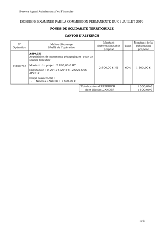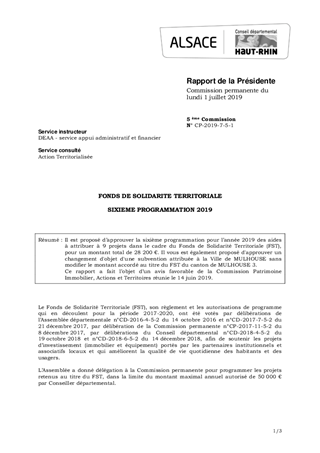 Il est proposé d’approuver la sixième programmation pour l’année 2019 des aides à attribuer à 9 projets dans le cadre du Fonds de Solidarité Territoriale (FST), pour un montant total de 28 200 €. Il vous est également proposé d'approuver un changement d'objet d'une subvention attribuée à la Ville de MULHOUSE sans modifier le montant accordé au titre du FST du canton de MULHOUSE 3. Ce rapport a fait l’objet d’un avis favorable de la Commission Patrimoine Immobilier, Actions et Territoires réunie le 14 juin 2019.