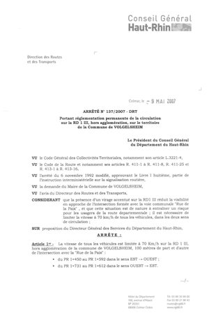 portant réglementation permanente de la circulation sur la RD 1 III, hors agglomération, sur le territoire de la commune de VOLGELSHEIM. Resumé Pièces jointes ARRETE Assemblée : Non défini Date : 09/05/2007 Rapporteur : Non défini Collectivité : Conseil départemental du Haut-Rhin Direction : Non défini Service : Direction des Routes Domaine : Circulation Commission :