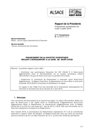 Le présent rapport a pour objet : - d'attribuer une participation financière de 469 456,68 € à Saint-Louis Agglomération pour le fonctionnement de la navette touristique reliant l'EuroAirPort à la gare de Saint-Louis pour la période 2019/2025, - d'approuver la convention de financement à intervenir entre Saint-Louis Agglomération , la Région Grand Est, le Département du Haut-Rhin et m2A pour la période 2019/2025 et d'autoriser la Présidente à la signer. Ce rapport a fait l'objet d'un avis favorable de la Commission Aménagement du Territoire et Tourisme lors de sa réunion du 7 juin 2019.