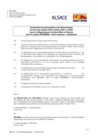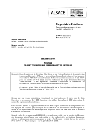 Dans le cadre de la Stratégie OberRhein et de l'intensification de la coopération transfrontalière entre l'Alsace et ses voisins allemands et suisses, il est proposé d'accorder à NEUREX une subvention de fonctionnement maximale de 30 000 € pour les années 2019 à 2022 pour la réalisation du projet trinational Interreg "Inter-neurone". Il est également demandé d'approuver la convention de financement y afférente et d'autoriser la Présidente à la signer. Ce rapport a fait l'objet d'un avis favorable de la Commission Aménagement du Territoire et Tourisme réunie le 7 juin 2019.