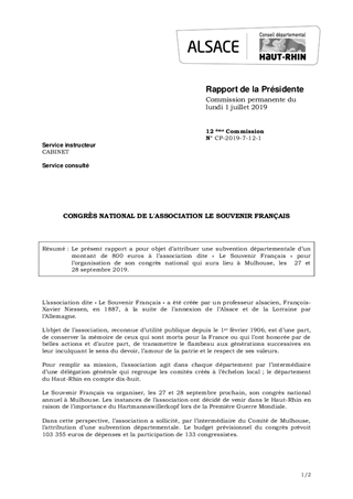 Le présent rapport a pour objet d’attribuer une subvention départementale d’un montant de 800 euros à l’association dite « Le Souvenir Français » pour l’organisation de son congrès national qui aura lieu à Mulhouse, les 27 et 28 septembre 2019.