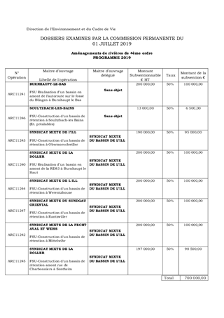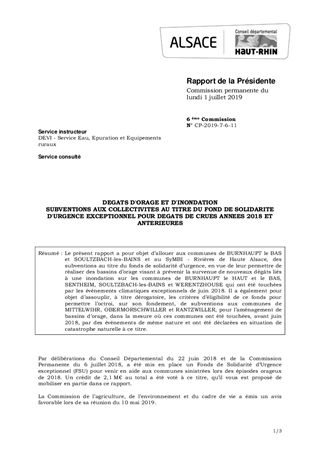Le présent rapport a pour objet d’allouer aux communes de BURNHAUPT le BAS et SOULTZBACH-les-BAINS et au SyMBI - Rivières de Haute Alsace, des subventions au titre du fonds de solidarité d’urgence, en vue de leur permettre de réaliser des bassins d’orage visant à prévenir la survenue de nouveaux dégâts liés à une inondation sur les communes de BURNHAUPT le HAUT et le BAS, SENTHEIM, SOULTZBACH-les-BAINS et WERENTZHOUSE qui ont été touchées par les événements climatiques exceptionnels de juin 2018. Il a également pour objet d’assouplir, à titre dérogatoire, les critères d’éligibilité de ce fonds pour permettre l’octroi, sur son fondement, de subventions aux communes de MITTELWIHR, OBERMORSCHWILLER et RANTZWILLER, pour l’aménagement de bassins d’orage, dans la mesure où ces communes ont été touchées, avant juin 2018, par des événements de même nature et ont été déclarées en situation de catastrophe naturelle à ce titre.