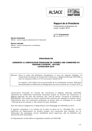 STRATEGIE ORADHESION A L'ASSOCIATION FRANCAISE DU CONSEIL DES COMMUNES ET REGIONS D'EUROPE - AFCCRECOTISATION 2019