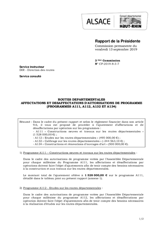 ROUTES DEPARTEMENTALESAFFECTATIONS ET DESAFFECTATIONS D'AUTORISATIONS DE PROGRAMME(PROGRAMMES A111, A112, A132 ET A134)