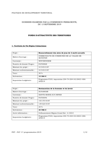 Il est proposé d’approuver la première programmation pour l’année 2019 des aides à attribuer à 78 projets dans le cadre de la Politique de Développement Territorial (PDT), pour un montant total de 3 450 059 €. Il est également demandé d’approuver les conventions de financement afférentes à 3 subventions à intervenir avec 3 associations et d’en autoriser la signature par la Présidente ou son représentant. Ce rapport a fait l’objet d’un avis favorable de la Commission Patrimoine Immobilier, Actions et Territoires réunie le 14 juin 2019.