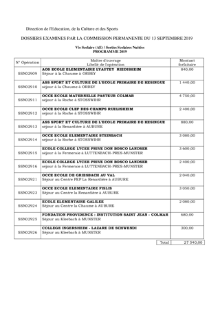 POLITIQUE DE L'EDUCATION ET DE LA JEUNESSEVIE SCOLAIRESORTIES SCOLAIRES AVEC NUITEES 2019 - 4ÈME LISTE