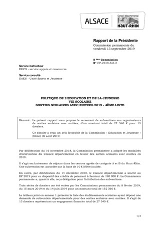 Le présent rapport vous propose le versement de subventions aux organisateurs de sorties scolaires avec nuitées, d’un montant total de 27 540 € pour 13 dossiers. Ce dossier a reçu un avis favorable de la Commission « Education et Jeunesse » (8ème) 30 août 2019.