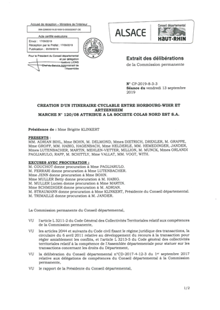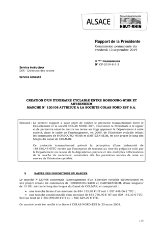 CREATION D'UN ITINERAIRE CYCLABLE ENTRE HORBOURG-WIHR ET ARTZENHEIMMARCHE N° 120/08 ATTRIBUE A LA SOCIETE COLAS NORD EST S.A.