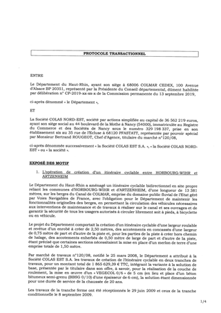 Le présent rapport a pour objet de valider le protocole transactionnel entre le Département et la société COLAS NORD-EST, d’autoriser la Présidente à le signer et de permettre ainsi de mettre un terme au litige opposant le Département à cette société, dans le cadre de l’aménagement, en 2009, de l’itinéraire cyclable reliant les communes de HORBOURG-WIHR et d’ARTZENHEIM, en site propre le long des berges du canal de COLMAR. Ce protocole transactionnel prévoit la perception d’une indemnité de 188 566,45 €TTC versée par l’entreprise de travaux au titre du préjudice subi par le Département en raison de la dégradation précoce et des multiples déformations de la couche de roulement, constatées dès les premières années de mise en service de l’itinéraire cyclable.