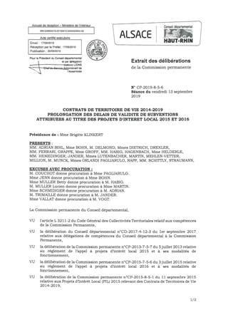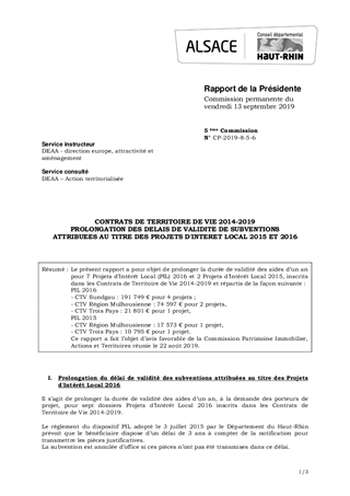 Le présent rapport a pour objet de prolonger la durée de validité des aides d’un an pour 7 Projets d’Intérêt Local (PIL) 2016 et 2 Projets d’Intérêt Local 2015, inscrits dans les Contrats de Territoire de Vie 2014-2019 et répartis de la façon suivante : PIL 2016 - CTV Sundgau : 191 749 € pour 4 projets ; - CTV Région Mulhousienne : 74 597 € pour 2 projets, - CTV Trois Pays : 21 801 € pour 1 projet, PIL 2015 - CTV Région Mulhousienne : 17 573 € pour 1 projet, - CTV Trois Pays : 10 795 € pour 1 projet. Ce rapport a fait l’objet d’avis favorable de la Commission Patrimoine Immobilier, Actions et Territoires réunie le 22 août 2019.