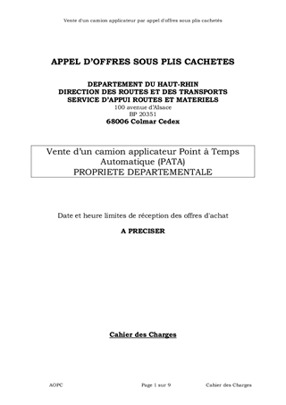 VENTE D'UN CAMION APPLICATEUR POINT A TEMPS AUTOMATIQUE (PATA) PAR APPEL D'OFFRES SOUS PLIS CACHETES