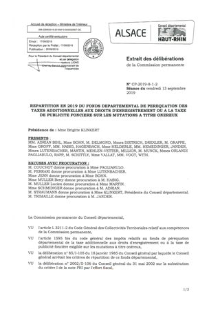 REPARTITION EN 2019 DU FONDS DEPARTEMENTAL DE PEREQUATION DES TAXES ADDITIONNELLES AUX DROITS D'ENREGISTREMENT OU A LA TAXE DE PUBLICITE FONCIERE SUR LES MUTATIONS A TITRE ONEREUX