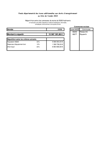 Il est proposé à votre Assemblée de répartir le montant de 13 967 381,66 € collecté en 2018 (en augmentation de 40,7 % par rapport à l’année 2017) au Fonds départemental de la taxe additionnelle aux droits d'enregistrement entre les communes de moins de 5 000 habitants.