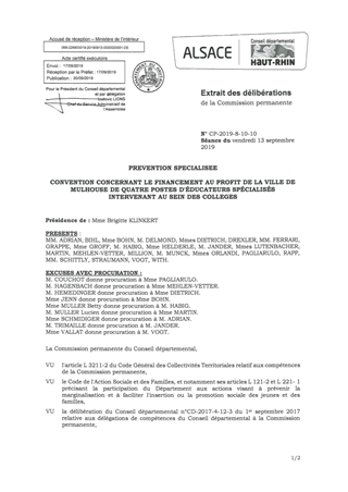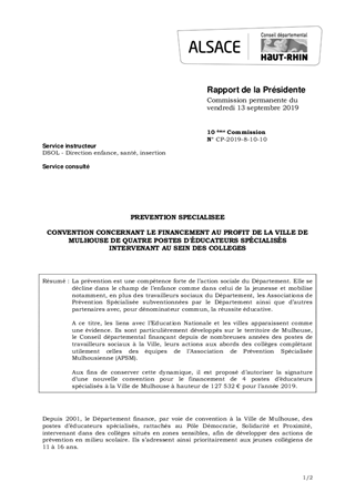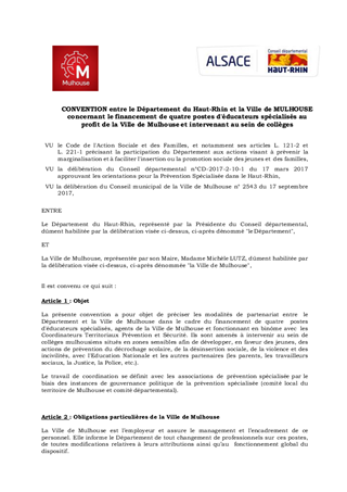 PREVENTION SPECIALISEECONVENTION CONCERNANT LE FINANCEMENT AU PROFIT DE LA VILLE DE MULHOUSE DE QUATRE POSTES D'ÉDUCATEURS SPÉCIALISÉS INTERVENANT AU SEIN DES COLLEGES