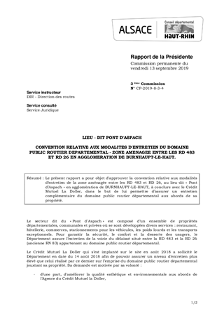 Le présent rapport a pour objet d'approuver la convention relative aux modalités d’entretien de la zone aménagée entre les RD 483 et RD 26, au lieu-dit « Pont d’Aspach » en agglomération de BURNHAUPT-LE-HAUT, à conclure avec le Crédit Mutuel La Doller, dans le but de lui permettre d’assurer un entretien complémentaire du domaine public routier départemental aux abords de sa propriété.
