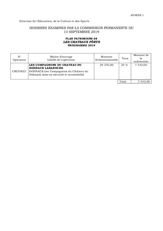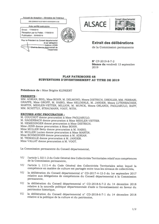 PLAN PATRIMOINE 68SUBVENTIONS D'INVESTISSEMENT AU TITRE DE 2019