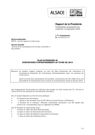 Le présent rapport propose, au titre du Plan Patrimoine 68, d’attribuer et d'autoriser le versement de subventions d’investissement pour un montant de 2 297 534 €. Après la tenue des commissions territoriales, ces dossiers ont fait l’objet d’un avis favorable de la Commission de la Culture et du Patrimoine réunie le 28 juin 2019.