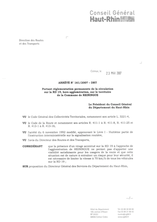 portant réglementation permanente de la circulation sur la RD 19, hors agglomération, sur le territoire de la commune de REININGUE. Resumé Pièces jointes ARRETE Assemblée : Non défini Date : 23/05/2007 Rapporteur : Non défini Collectivité : Conseil départemental du Haut-Rhin Direction : Non défini Service : Direction des Routes Domaine : Circulation Commission :