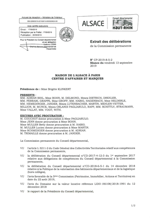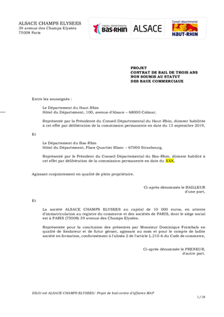 Il est proposé d'approuver les termes du projet de bail à intervenir avec le nouveau preneur du centre d'affaires de la Maison de l'Alsace à PARIS, d'autoriser la cession gratuite au profit des Départements du Haut-Rhin et du Bas-Rhin des marques verbales françaises « LA MAISON DE L’ALSACE » et « LA MAISON DE L’ALSACE A PARIS » déposées par la SAS MDA PARTNERS, et de se prononcer en faveur de la nécessité d'assurer une protection renforcée de la marque semi-figurative Maison de l'Alsace Champs Elysées propriété des deux Départements.