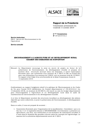 Le Département encourage la mise en œuvre de projets en faveur de la préservation de l’environnement, du développement durable et propose de soutenir deux structures œuvrant dans ces domaines, à savoir l'association Euromaïs pour une subvention d'un montant de 5 500 € et Bio en Grand Est pour une subvention d'un montant de 5 000 €, soit un montant total de 10 500 €. Ce rapport à fait l'objet d'un avis favorable de la 6ème Commission réunie le 13 septembre 2019.