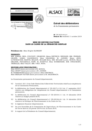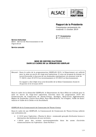 Dans le cadre de la programmation GERPLAN 2019, le Département est sollicité pour la mise en œuvre de vingt-neuf opérations. Il vous est proposé de donner un accord favorable à chacune de ces demandes représentant un montant total de 71 064 €, dont 35 674 € en investissement et 35 390 € en fonctionnement. Ce rapport a fait l'objet d'un avis favorable de la 6ème Commission réunie le 25 janvier et le 22 mars 2019.
