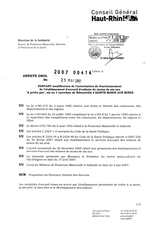 portant modification de l'autorisation de fonctionnement de l'établissement d'accueil d'enfants de moins de six ans "A petits pas", sis au 1 carrefour de Ribeauvillé à SAINTE MARIE AUX MINES. Resumé Pièces jointes ARRETE Assemblée : Non défini Date : 25/05/2007 Rapporteur : Non défini Collectivité : Conseil départemental du Haut-Rhin Direction : Non défini Service : Service de Protection Maternelle et Infantile Domaine : Accueil d'enfants Commission :