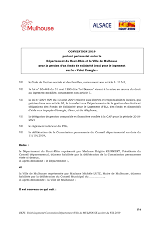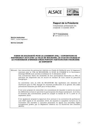 Les conventions de partenariat relatives au Fonds de Solidarité pour le Logement conclues avec la Ville de MULHOUSE, le CCAS de COLMAR et le fournisseur d'énergie ENGIE sont arrivées à échéance le 31 décembre 2018. Ces conventions fixent les modalités de leur participation financière au FSL et précisent les dispositifs mis en œuvre en matière de lutte contre la précarité énergétique. La convention avec la Ville de MULHOUSE fixe également ses missions de secrétariat pour le FSL Energie du territoire mulhousien et la gestion des aides préventives financées par EDF pour le Haut-Rhin. Il est ainsi proposé de renouveler ces conventions de manière à mettre en œuvre les différentes actions et percevoir la participation de chaque partenaire. A ce titre, le montant des contributions prend en compte la baisse de 45 % votée le 14 septembre 2018. Il est également proposé la signature d'un avenant à la convention de partenariat avec EDF signée le 22 novembre 2018, de manière à compléter l'article sur le traitement des données à caractère personnel eu égard aux nouvelles règles européennes posées par le Règlement Général sur la Protection des Données (RGPD).
