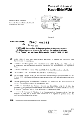 portant abrogation de l'autorisation de fonctionnement de l'établissement d'accueil d'enfants de moins de six ans "Tom Pouce", sis au 2 rue d'Oberdorf à HAGENTHAL LE BAS. Resumé Pièces jointes ARRETE Assemblée : Non défini Date : 29/05/2007 Rapporteur : Non défini Collectivité : Conseil départemental du Haut-Rhin Direction : Non défini Service : Service de Protection Maternelle et Infantile Domaine : Accueil d'enfants Commission :