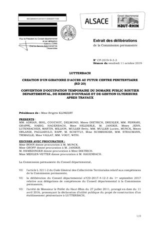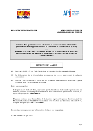 Le présent rapport a pour objet d’approuver la convention d’occupation temporaire du domaine public routier départemental et de remise d’ouvrage après travaux, autorisant la création du giratoire d’accès au centre pénitentiaire de LUTTERBACH et définissant les modalités d’aménagement et de mise à disposition des terrains nécessaires ainsi que celles de son transfert ultérieur dans le domaine public départemental.