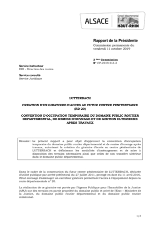 LUTTERBACHCREATION D'UN GIRATOIRE D'ACCES AU FUTUR CENTRE PENITENTIAIRE (RD 20)CONVENTION D'OCCUPATION TEMPORAIRE DU DOMAINE PUBLIC ROUTIER DEPARTEMENTAL, DE REMISE D'OUVRAGE ET DE GESTION ULTERIEURE APRES TRAVAUX
