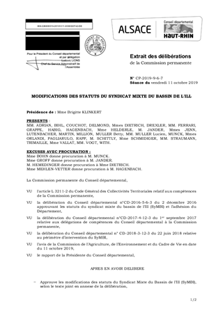 Le Syndicat Mixte du Bassin de l'Ill (SyMBI) a été créé en application de la loi MAPTAM pour exercer vis-à-vis de ses membres un certain nombre de missions, en particulier en se substituant au Département dans son rôle vis à vis des syndicats de rivières. Il vous est proposé principalement d'en approuver la nouvelle dénomination officielle (Rivières de Haute Alsace), d'entériner la liste de ses nouveaux membres, suite aux fusions-extensions de syndicats intervenues, ainsi que les modifications de la carte des adhésions et prestations offertes. Il convient également de confirmer l'adhésion du Département et de compléter ses représentants au SyMBI - Rivières de Haute Alsace.