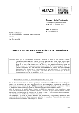 Pour que le Département continue à exercer au delà du 1er janvier 2020 la compétence GEMAPI qu'il exerce au titre des ouvrages dont il est propriétaire (barrages et ouvrages de soutien d'étiage/écrêtements des crues), il est nécessaire, selon la loi du 30 décembre 2017, de conclure des conventions ad hoc avec les EPCI porteurs de cette compétence et les syndicats de rivières, auxquels elle a été confiée, concernés par des ouvrages départementaux. Il vous est donc proposé d'approuver les 6 projets de conventions avec ces collectivités et d'autoriser la Présidente à les signer. Ce rapport a fait l'objet d'un avis favorable par la 6ème Commission réunie le 13 septembre 2019.