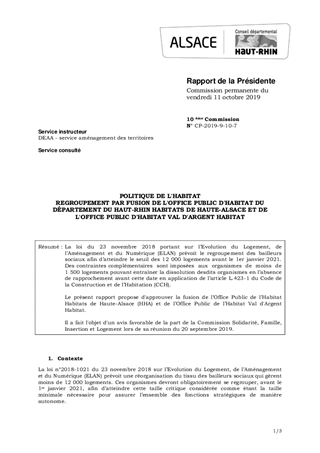 La loi du 23 novembre 2018 portant sur l’Evolution du Logement, de l’Aménagement et du Numérique (ELAN) prévoit le regroupement des bailleurs sociaux afin d’atteindre le seuil des 12 000 logements avant le 1er janvier 2021. Des contraintes complémentaires sont imposées aux organismes de moins de 1 500 logements pouvant entraîner la dissolution desdits organismes en l’absence de rapprochement avant cette date en application de l’article L.423-1 du Code de la Construction et de l’Habitation (CCH). Le présent rapport propose d'approuver la fusion de l’Office Public de l’Habitat Habitats de Haute-Alsace (HHA) et de l’Office Public de l’Habitat Val d'Argent Habitat. Il a fait l'objet d'un avis favorable de la part de la Commission Solidarité, Famille, Insertion et Logement lors de sa réunion du 20 septembre 2019.